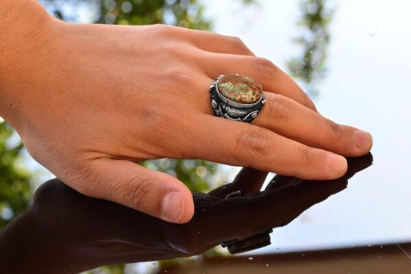 Arizona turkuaz taşlı erkek yüzüğümüz, gerçek taşların ve tarihi tasarımların güzelliğini takdir edenler için mükemmel bir el yapımı takı parçasıdır. Yüksek kaliteli 925 ayar gümüşten el işçiliği ile üretilen bu yüzük, dayanıklılık ve kalıcı bir parlaklık sağlar. Karmaşık Bizans esintili tasarımı ve gerçek doğal Arizona turkuaz taşı, tarihi bir zarafet katmakta ve bu yüzüğü herhangi bir takı koleksiyonuna benzersiz bir ek haline getirmektedir.