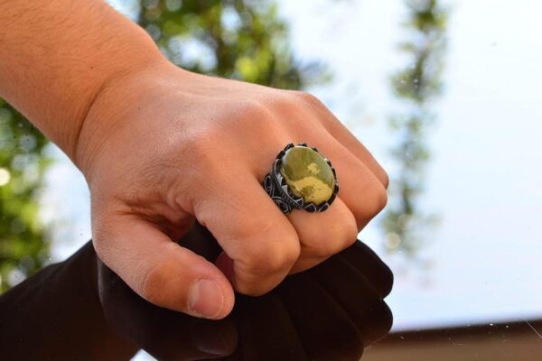 Arizona turkuaz taşından yapılmış erkek yüzüğümüz, gerçek taşların güzelliğini takdir edenler için mükemmel bir doğum taşı mücevheri parçasıdır. Yüksek kaliteli 925 ayar gümüş ile el yapımı olarak üretilen bu yüzük, dayanıklılık ve kalıcı bir parlaklık sağlar. İnce tasarımı ve gerçek doğal Arizona turkuaz taşı, ona şıklık katan bir dokunuş ekleyerek her mücevher koleksiyonuna benzersiz bir katkı sunar.