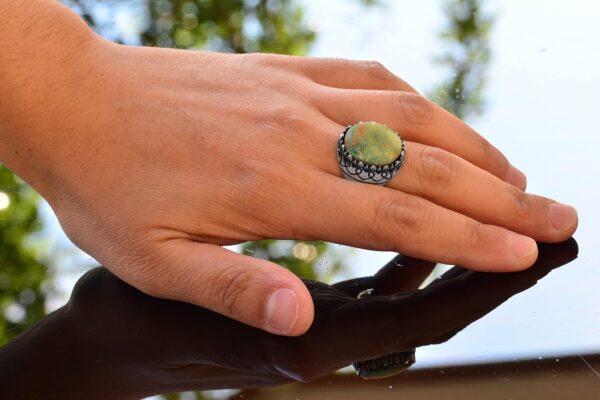 Arizona turkuaz taşı erkek yüzüğümüz, gerçek taşların güzelliğini takdir edenler için mükemmel bir doğum taşı takısıdır. Yüksek kaliteli 925 ayar gümüşle el yapımı olarak üretilen bu yüzük, dayanıklılığını ve kalıcı parlaklığını garanti eder. Karmaşık tasarımı ve gerçek doğal Arizona turkuaz taşı, ona zarif bir dokunuş katmakta ve her takı koleksiyonuna benzersiz bir katkı sağlamaktadır.