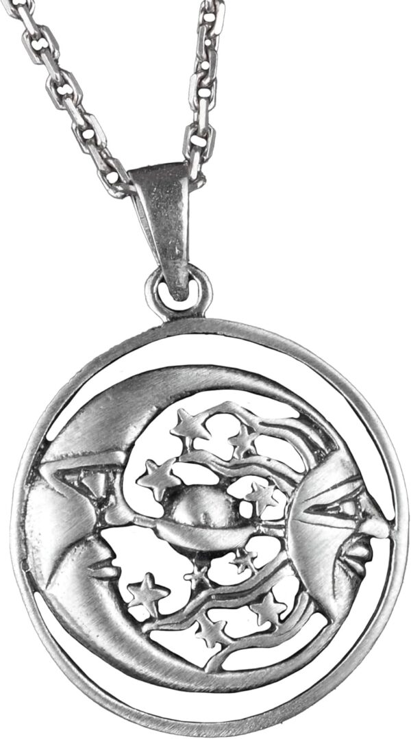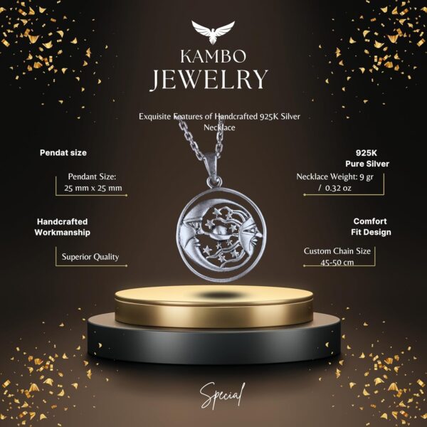 - Usta zanaatkarlar tarafından el yapımı olarak üretilen bu ayar gümüş kolye, olağanüstü işçilik ve detaylara dikkat ile dikkat çekmektedir. Güneş ve ayın karmaşık tasarımı görünümünüze şık bir dokunuş katmakta, her türlü etkinlik için mükemmel bir seçim oluşturmaktadır.