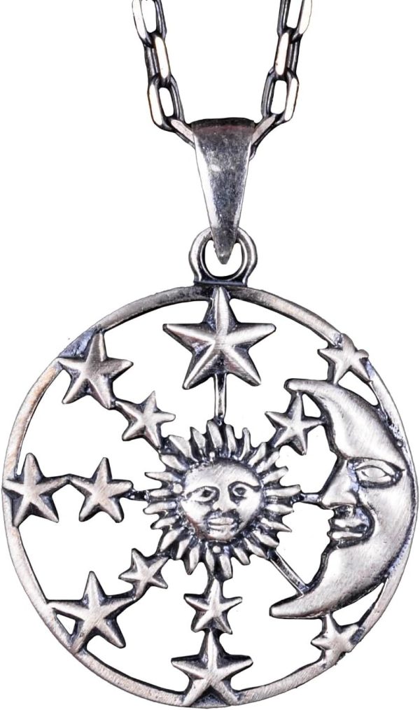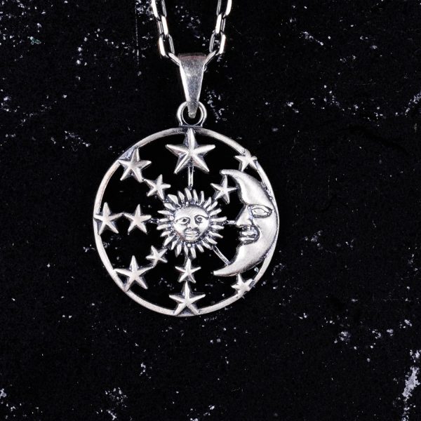 Bu özenle tasarlanmış göksel kolye ucu, yüksek kaliteli 925 ayar gümüşten üretilmiştir ve güneş, ay ve yıldızların çarpıcı bir tasvirini sergilemektedir. Zarif tasarımı, gündüz ve gece, aydınlık ve karanlık arasındaki dengeyi ve birliği simgeler, bu da onu kozmik sembollere ilgi duyanlar için anlamlı bir aksesuar yapar.