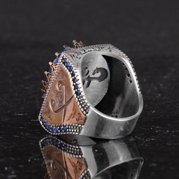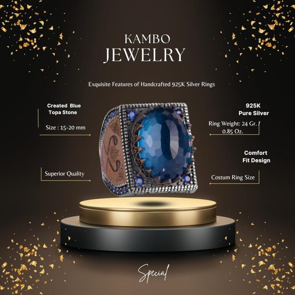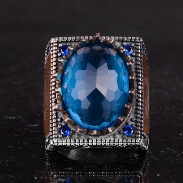 925 Ayar Gümüş İslami Yüzük, Yapay Taş Yüzük, El Yapımı Hat Yazılı Yüzük (Yapay Mavi Topaz)