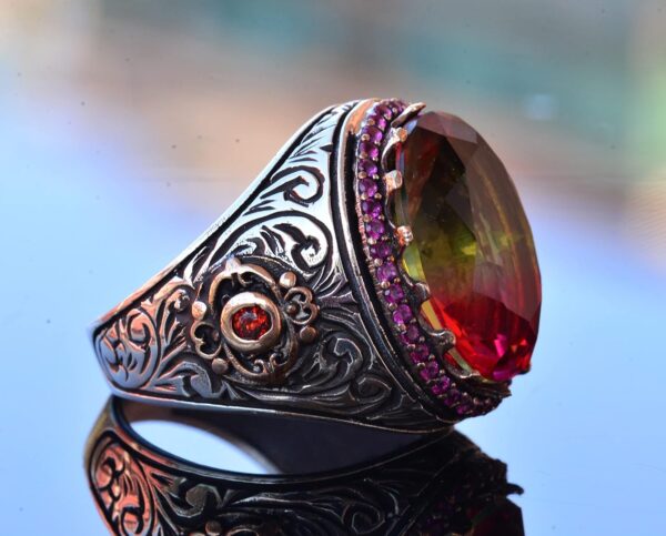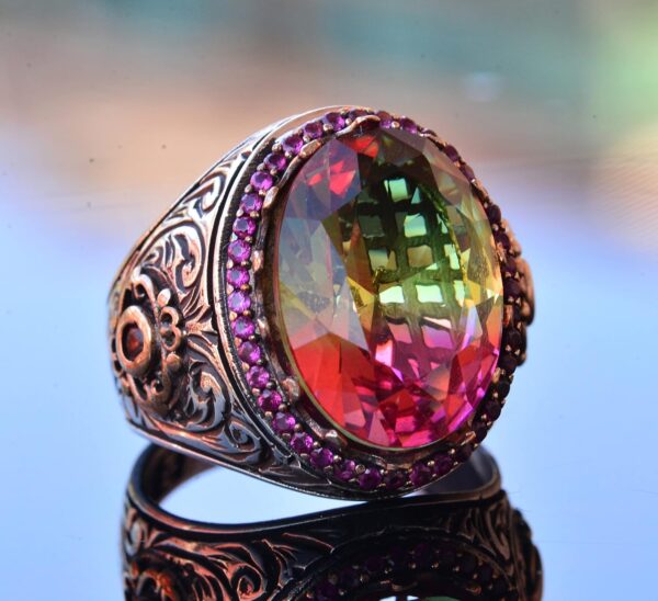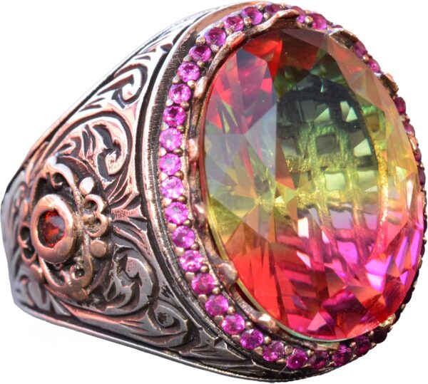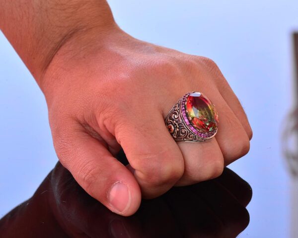 Bu muhteşem kral yüzük ile lüks ve stilin mükemmel birleşimini deneyimleyin. Yüzük, 925 ayar gümüş üzerine yerleştirilmiş çarpıcı çok renkli yapay taş ile süslenmiştir. Her yüzük, ince bir işçiliğin kanıtıdır; karmaşık tasarımlar ve titiz detaylara dikkat ile yapılmıştır.
