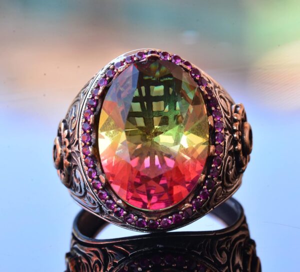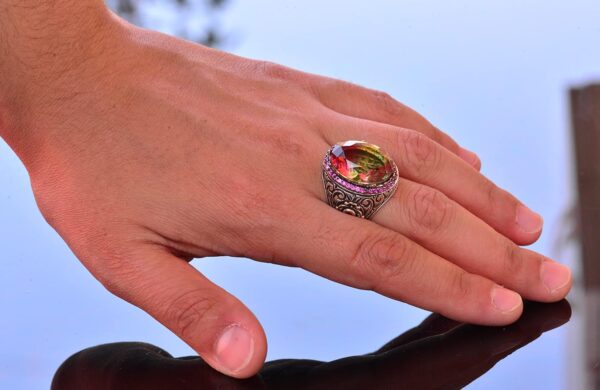 Çarpıcı Tasarım: Canlı, çok renkli yapay taş bu yüzüğün merkezinde yer alır ve onu herhangi bir takı koleksiyonuna benzersiz ve dikkat çekici bir ek yapar.
