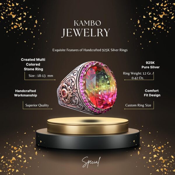 Çok renkli yapay taş ve 925 ayar gümüş ile mükemmel bir şekilde tasarlanmış bu çarpıcı kral yüzüğü ile takı koleksiyonunuza zarafet ve sofistike bir dokunuş katın.