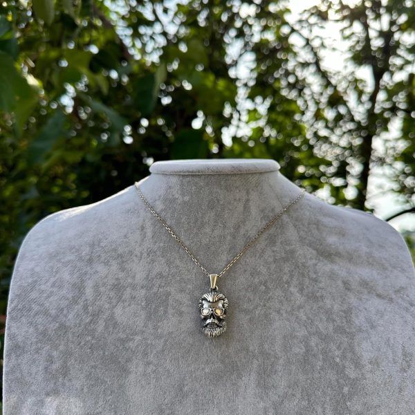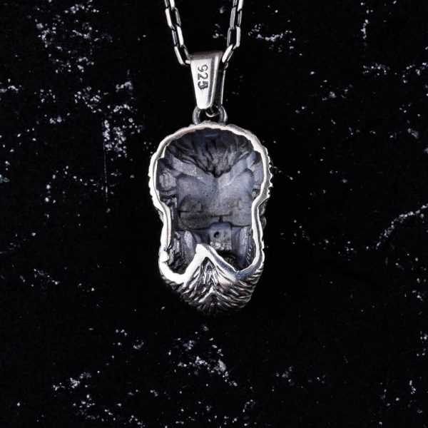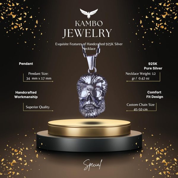 - Bu dikkat çekici sakallı kafatası kolyesi, dayanıklılık ve parlak bir yüzey sağlamak için yüksek kaliteli 925 ayar gümüşten üretilmiştir.