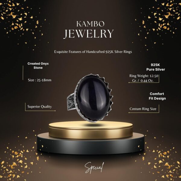 Bu dikkate değer erkek yüzük, yüksek kaliteli 925 ayar gümüşten el yapımıdır ve merkezinde çarpıcı bir oluşturulmuş oniks taşı bulunmaktadır. Oniksin derin siyah rengi, yüzüğün cesur tasarımıyla birleşerek güç, koruma ve yere bağlılık sembolü haline gelir ve bu da onu her erkeğin takı koleksiyonuna güçlü ve şık bir ekleme yapar.