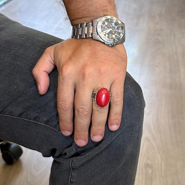 ÜRETMİŞ KIRMIZI MERCAN TAŞI İLE 925 AYAR GÜMÜŞ ERKEK YÜZÜK