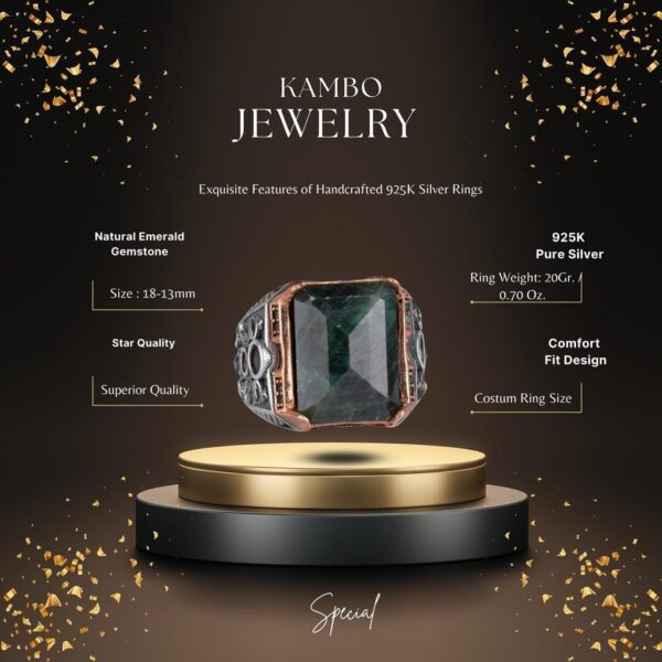 Bu el yapımı yüzük, 925 Ayar Gümüş’ten yapılmıştır ve canlı yeşil rengi ve lüks çekiciliği ile tanınan gerçek doğal Zümrüt taşını içermektedir. Yüzüğün tasarımı, Zümrüt taşının doğal güzelliğini vurgulamak için özenle hazırlanmıştır ve herhangi bir takı koleksiyonunda dikkat çekici bir parça olmasını sağlamaktadır.