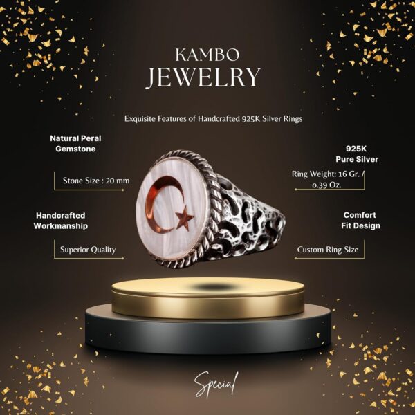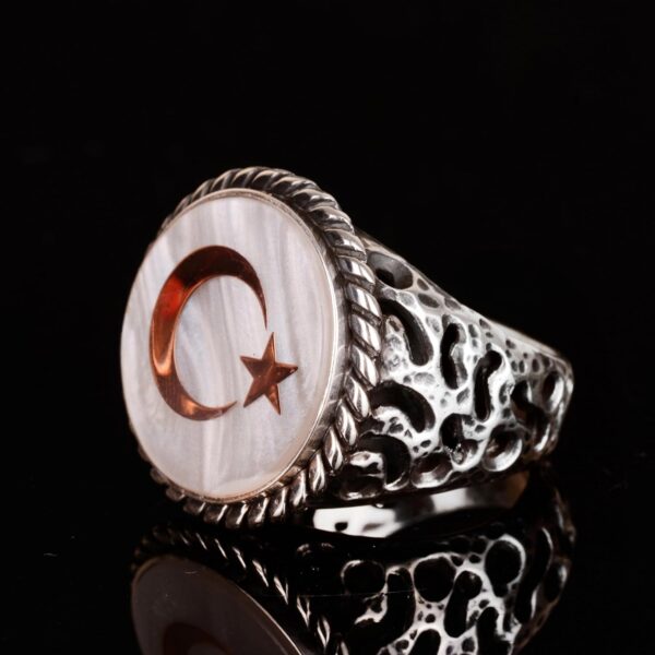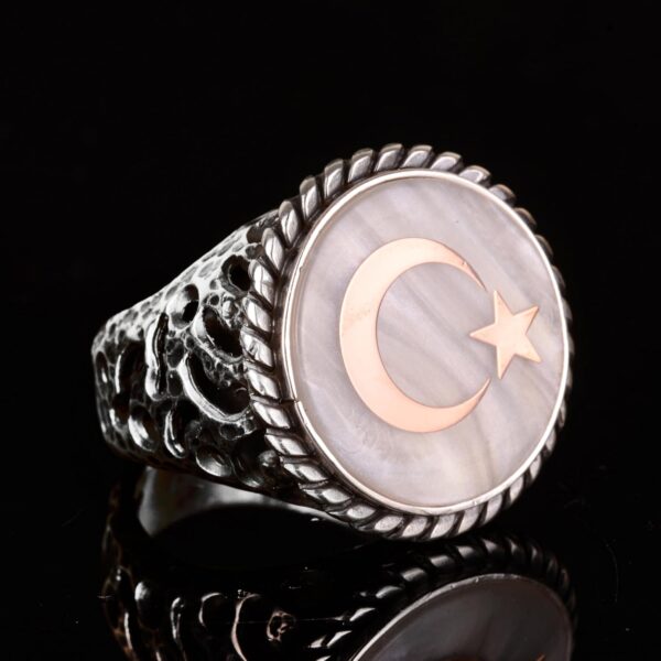 925K Ayar Gümüş Yüzüğünüzle stilinizi yükseltin, yüksek kaliteli gümüşten titizlikle işlenmiştir. Bu benzersiz yüzük, saf ve huzurlu görünümüyle bilinen muhteşem doğal beyaz bir taş içerir. Türk hilal ve yıldız tasarımı, miras ve gurur katarken, her özel durum için dikkat çekici bir parça olmasını sağlar.