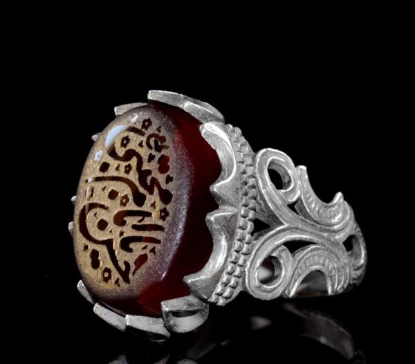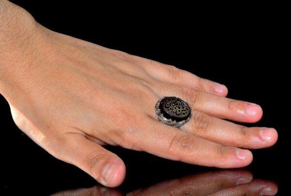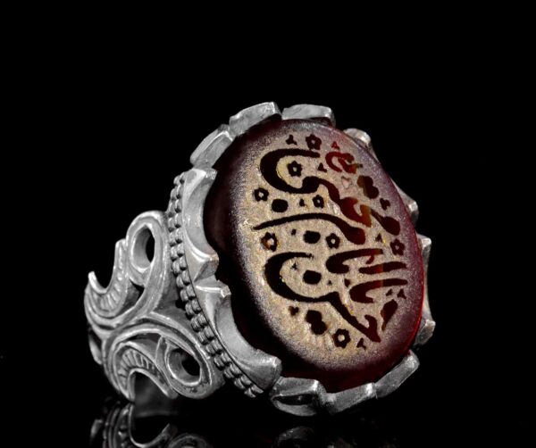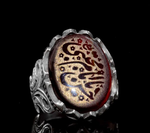 Bu güzel el yapımı yüzük, zarafet ve geleneğin gerçek bir temsilidir. Koruyucu ve dengeleyici özellikleriyle bilinen doğal Akik taşı, etrafında kültürel zenginlik ve manevi derinlik katacak şekilde ince Arap yazısıyla çevrelenmiştir.