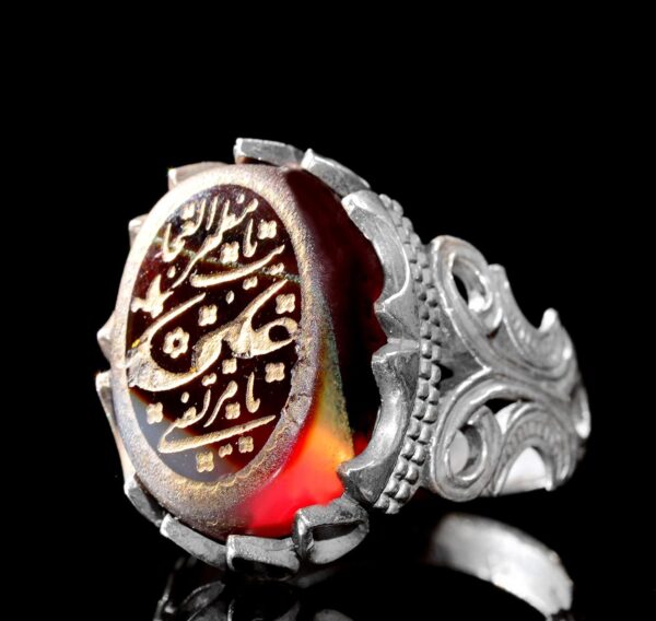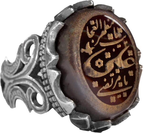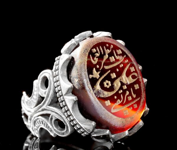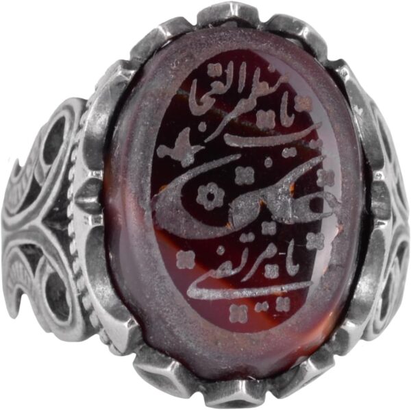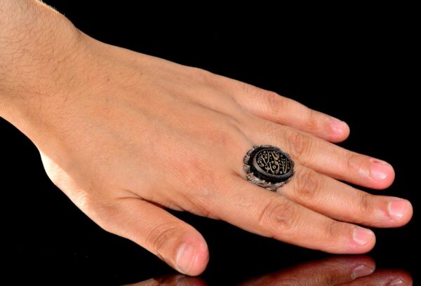 Doğal Akik Taşı ile 925 Ayar Gümüş Erkek Yüzük – Arap Hat Yazısı Tasarımı