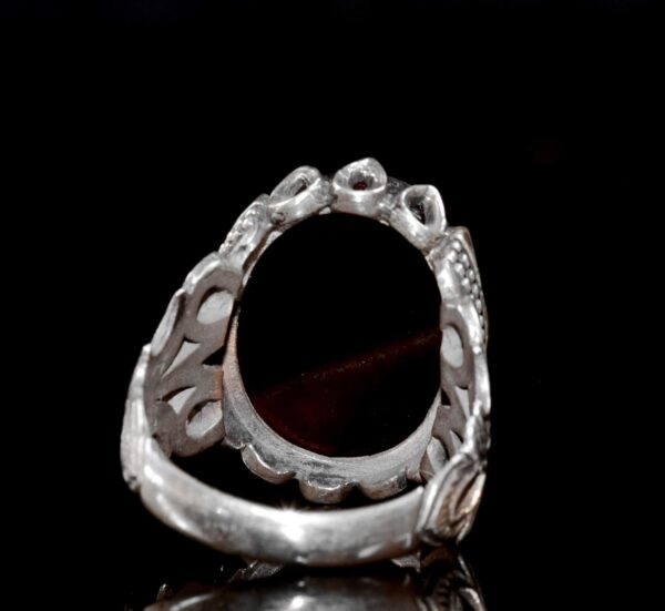Bu zarif tasarımlı 925 ayar gümüş yüzük ile ruhsal yolculuğunuzu yükseltin. Zengin, doğal Akik taşı ile süslenmiş olan bu yüzük, sadece güzel bir taş değil, aynı zamanda ruhsal bir arkadaş olarak bilinen toplayıcı ve koruyucu özelliklere sahiptir. Yüzük, kültürel ve dini önemini artıran karmaşık Arap hat yazısıyla süslenmiştir.