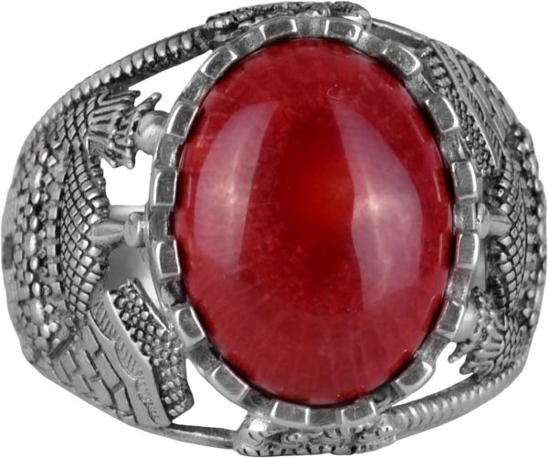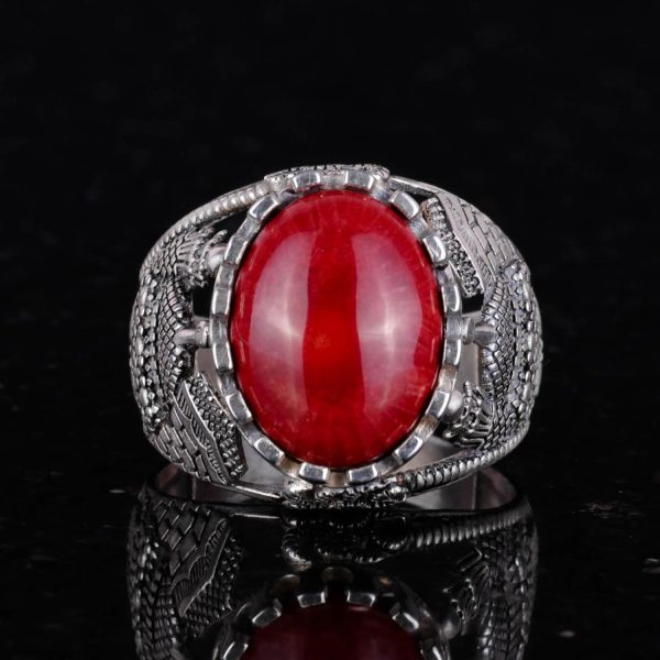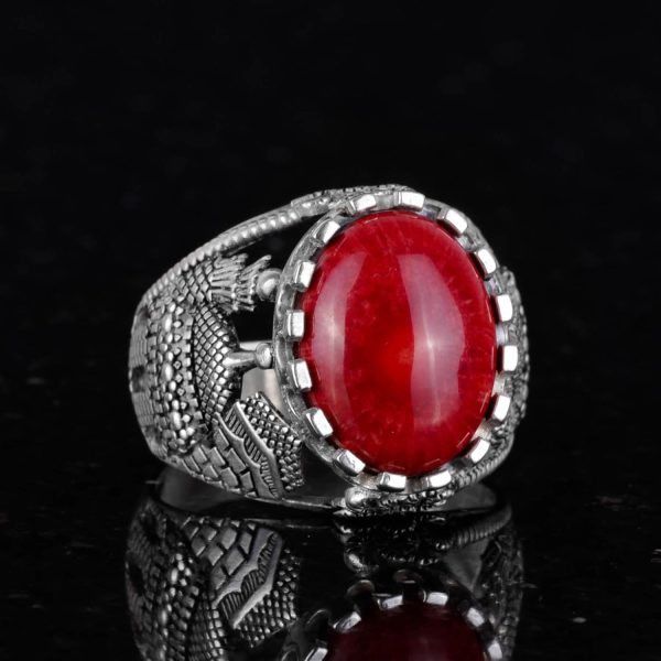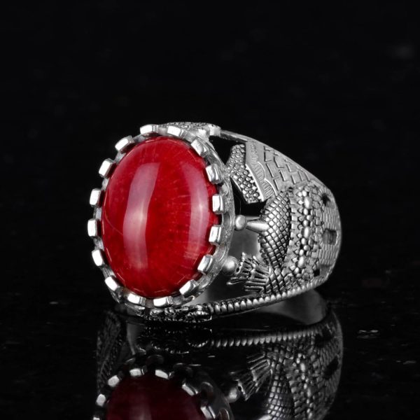 925 Ayar Gümüş Yüzük, Kırmızı Mercan Taşlı Yüzük, İslami Camii Gümüş Yüzük