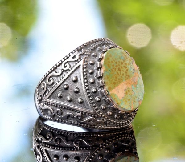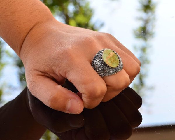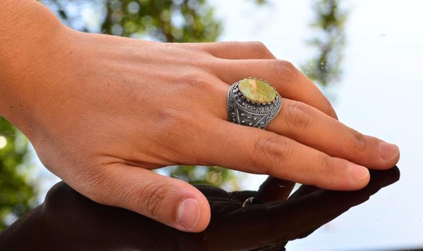 925 ayar gümüşten üretilen bu doğal Arizona turkuaz taşlı yüzük, vintage tarzıyla şıklığınızı tamamlayacak özel bir parça. El işçiliği ile hazırlanmış olan bu yüzük, yüksek kaliteli gümüş yapısı sayesinde dayanıklılığı ve uzun süreli parlaklığı garanti ediyor.
