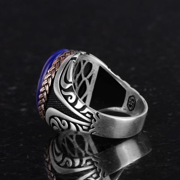 Bu benzersiz yüzük, yüksek kaliteli 925 ayar gümüşten üretilmiştir ve muhteşem bir Yapay Koyu Mavi Göz taşı ile süslenmiştir. Yüzüğün karmaşık tasarımı, gelenek ve modernliğin uyumlu bir birleşimini yansıtmakta olup, her şık takı koleksiyonuna olağanüstü bir katkı sağlar.