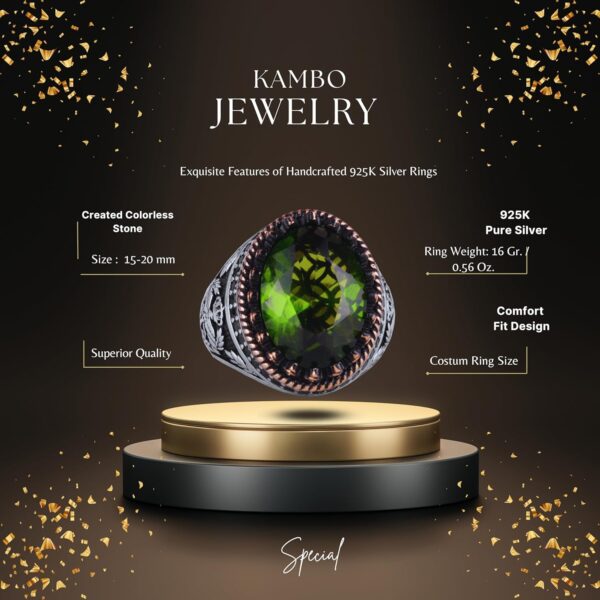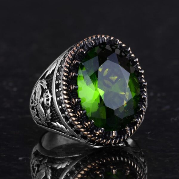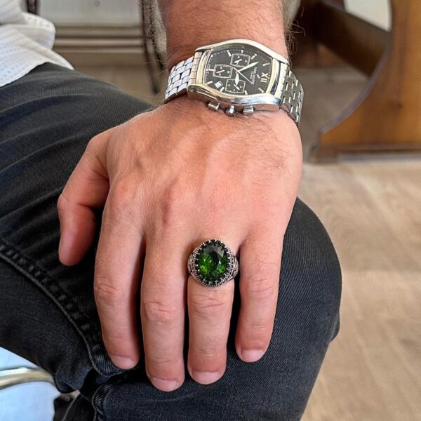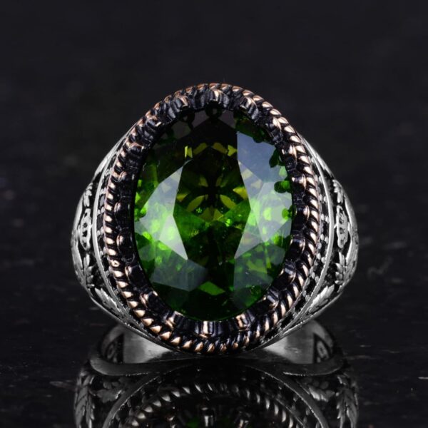Bu yüzüğün merkezinde, canlı rengi ve zarif görünümü ile seçilen bir yapay taş bulunmaktadır. Taş, tasarıma lüks bir dokunuş ekler ve cesur ve farklı takıları sevenler için mükemmel bir seçimdir.
