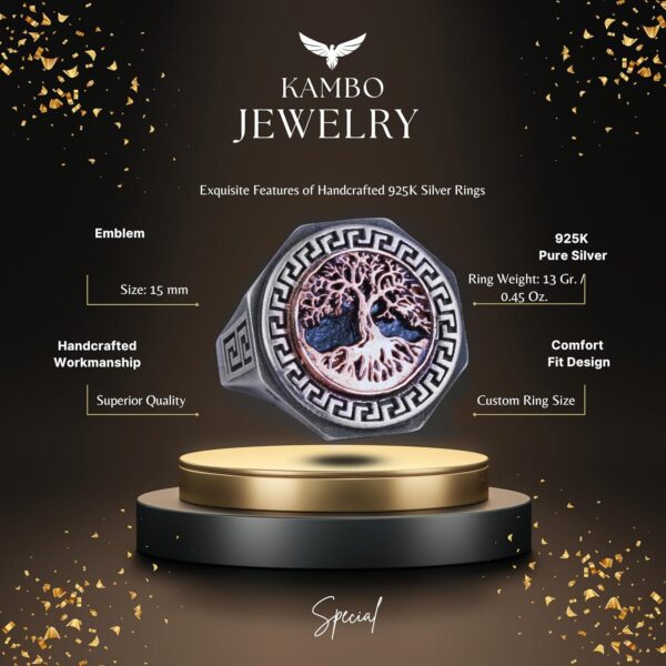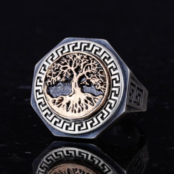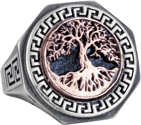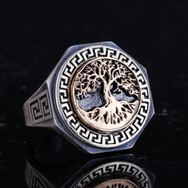 Erkekler için Hayat Ağacı Yüzüğü – 925K Gümüş El Yapımı Yüzük, Yunan Anahtar Deseni ile