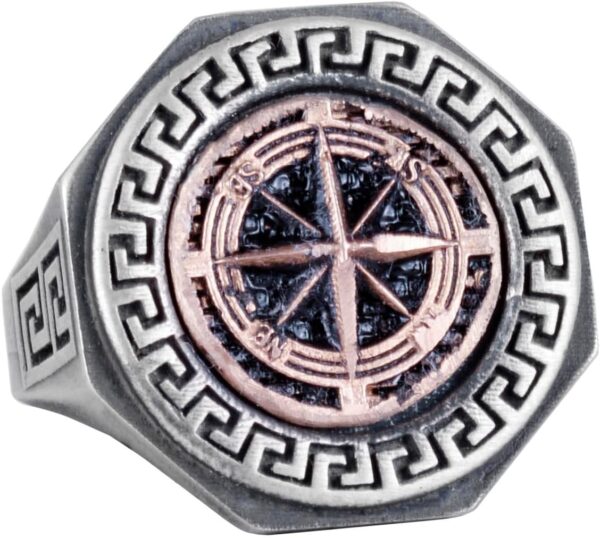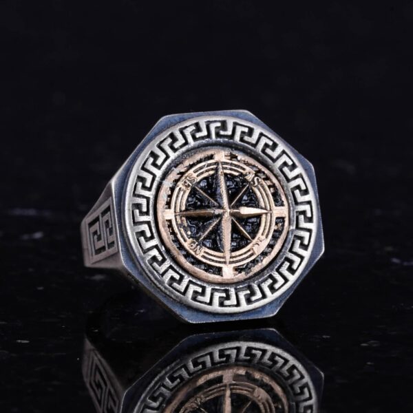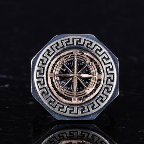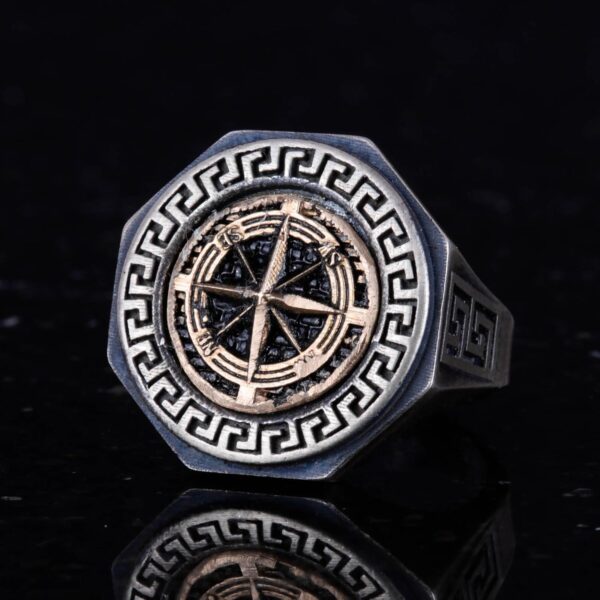Erkekler için Pusula Yüzüğü – 925 Ayar Gümüş El Yapımı Yüzük, Yunan Anahtar Deseni ile