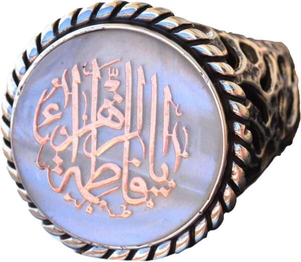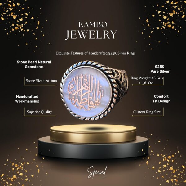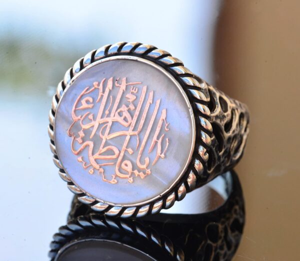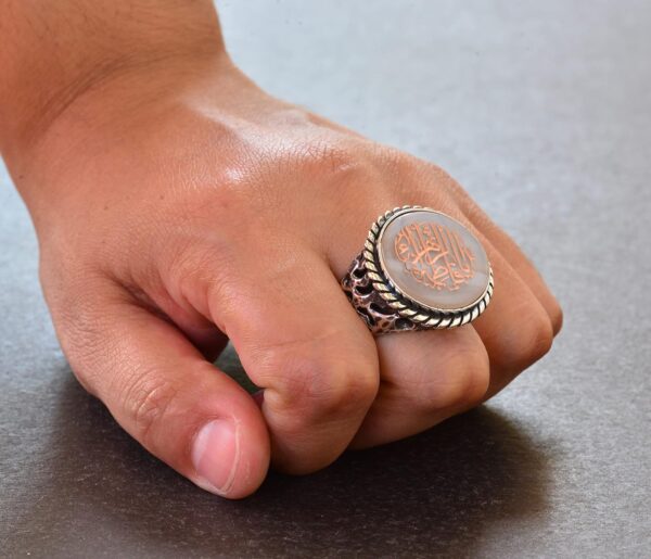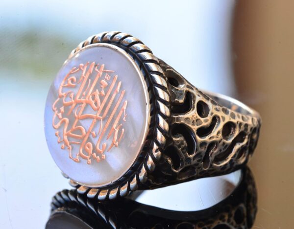 Tarzınızı 925K Sterlin Gümüş Yüzüğümüzle yükseltin, yüksek kaliteli sterlin gümüşten titizlikle üretilmiştir. Bu eşsiz yüzük, saf ve huzurlu görünümüyle bilinen muhteşem bir doğal beyaz taşla süslenmiştir. Arap hat sanatı tasarımı, inanç ve kültürel mirasa bir dokunuş ekleyerek, her türlü etkinlik için dikkat çekici bir parça haline getiriyor.