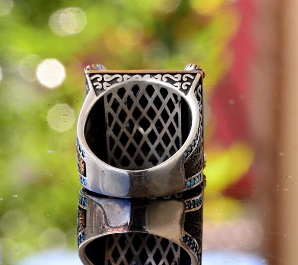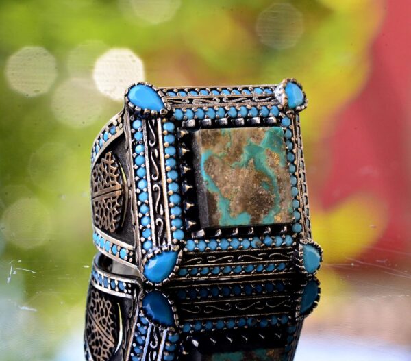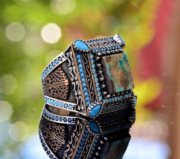 Arizona turkuaz taşlı erkek yüzüğümüz, gerçek taşların güzelliğini takdir edenler için mükemmel bir parça olan göz alıcı bir el yapımı takıdır. Yüksek kaliteli 925 ayar katı gümüşten el yapımı olarak üretilen bu yüzük, dayanıklılık ve kalıcı bir parlaklık sağlar. Karmaşık tasarımı ve gerçek doğal Arizona turkuaz taşı, sanatsal bir zarafet katmakta ve her takı koleksiyonuna benzersiz bir ekleme yapmaktadır.