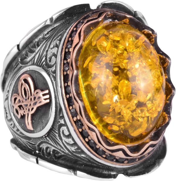925K Ayar Gümüş Erkek Yüzük, Oluşturulmuş Yüzük, Osmanlı Tuğrası Gümüş Yüzük (Açık Kehribar Oluşturulmuş)