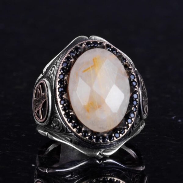925K Katı Gümüş Erkek Yüzük – Doğal Taşlarla El Yapımı Şıklık (Altın Rutilatlı Kuvars Taşı)