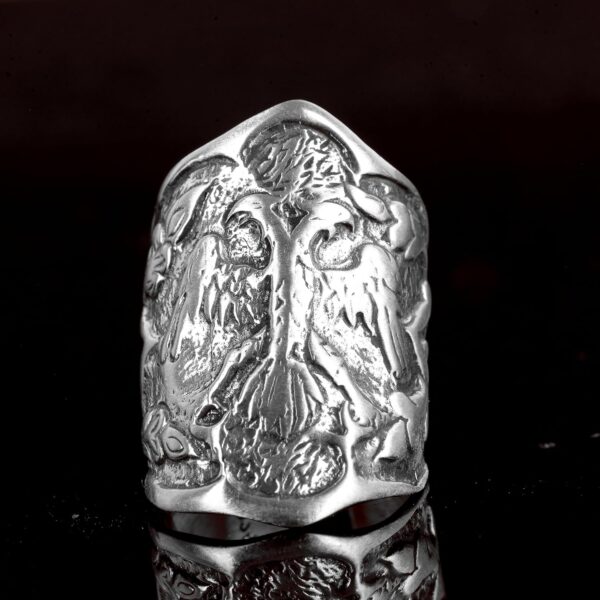 Zamanın ötesinde bir güç sembolü olan çift başlı kartal, bu yüzüğü süsler ve onu ayırt edici bir parça haline getirir.