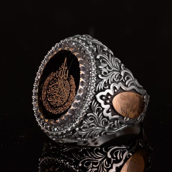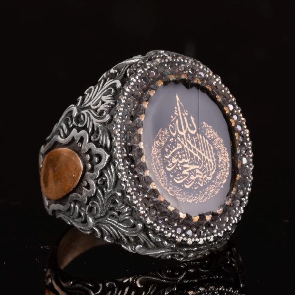 Yüzük, koruma, inanç ve ilahi bilgeliği temsil eden güçlü Ayat al-Kursi’yi sergilemektedir. Bu tasarım unsuru, yüzüğün görsel cazibesini artırmanın yanı sıra, kişinin ruhsal yolculuğunu ve inançlarını sürekli hatırlatan bir sembol işlevi görmektedir.