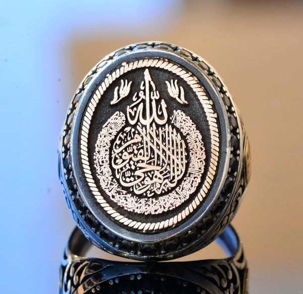 Bu yüzük, koruma ve manevi güç sağlayan önemli bir İslami yazıt olan Ayetel Kursi ayetini taşımaktadır. İnancın ve ilahi korumanın sürekli hatırlatıcısıdır.