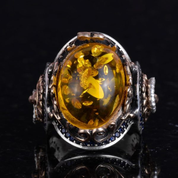 Bu muhteşem yüzük ile bal amberi oluşturulmuş taşın güzelliğini ve zarafetini, gümüşün zamansız çekiciliğini kucaklayın. Bugün sipariş verin ve stil ile zanaatkarlığın mükemmel birleşimini deneyimleyin.
