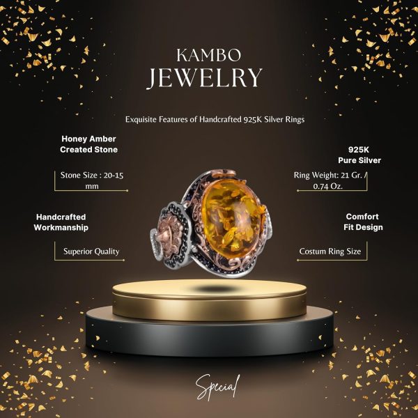 KAMBO Honey Amber Created Stone Yüzüğünün zarif güzelliğini ve büyüleyici cazibesini keşfedin. Bu muhteşem parça, dayanıklılığı ve zamansız çekiciliği garanti eden 925K katı gümüş bir bant ile tasarlanmıştır. Yüzük, sıcak altın tonları ve büyüleyici güzelliği ile bilinen güzel bir bal amberi taşını içermektedir.