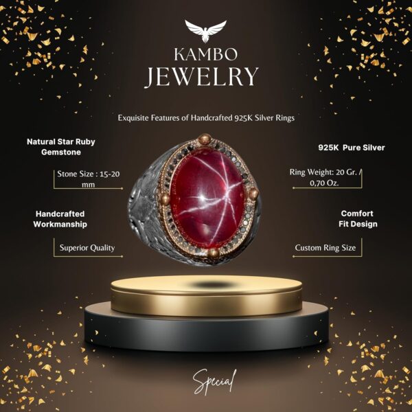 Büyük Doğal Yıldız Yakut Yüzük – Lily Desenli – 925 Ayar Gümüş El Yapımı Erkek Takısı