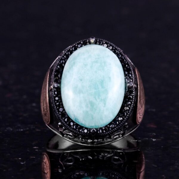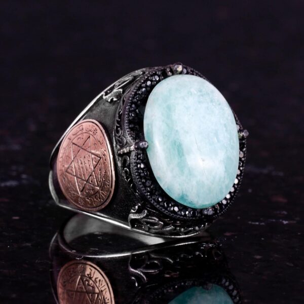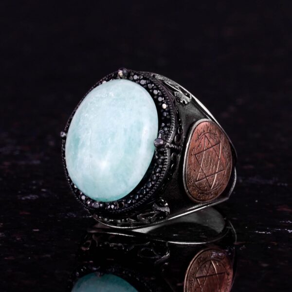 Doğal Cabochon Amazonit Taş Yüzük, Sürekli 925K Katı Gümüş Erkek Yüzüğü – Süleyman Mührü Gümüş Yüzük