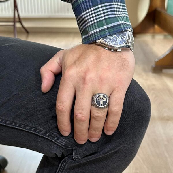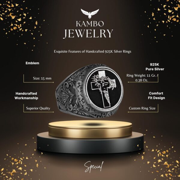- Hristiyan Sembolleri: Yüzük, İsa’ya olan bağlılığınızı ve bağlantınızı temsil eden belirgin bir haç tasarımını sergiler.
