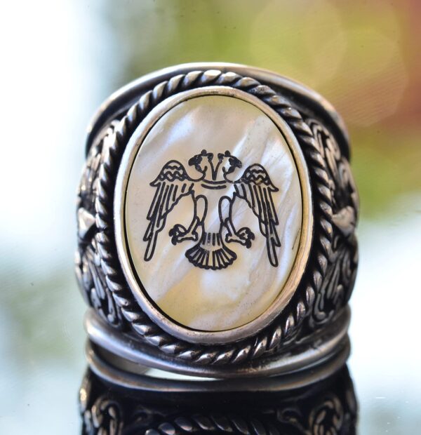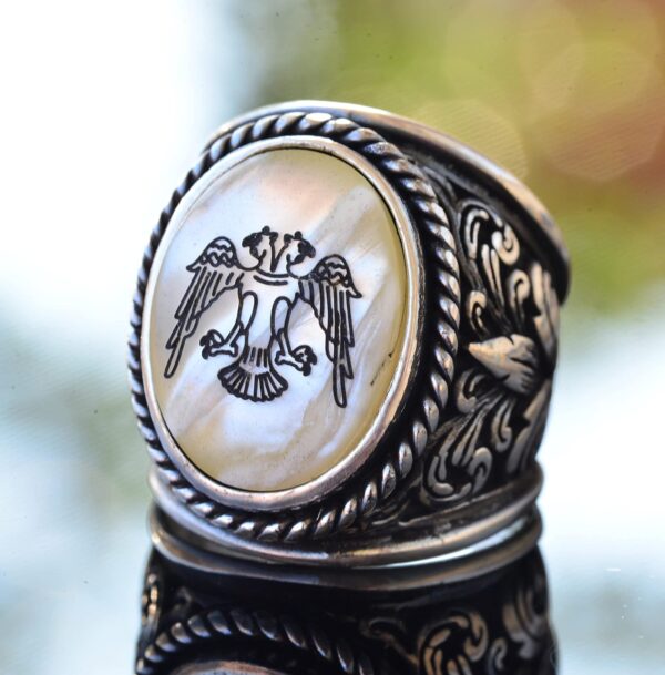 Yüzük, güç, kuvvet ve dayanıklılığı sembolize eden etkileyici bir ikiz başlı kartal figürü ile tasarlanmıştır. Her yüzük, kültürel mirası onurlandırmak için titizlikle tasarlanmış, tarihi ve kültürel anlam katmanları eklenmiştir.