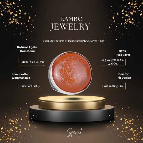 Yüzük, kendine has desenleri ve dengeleyici özellikleri ile bilinen gerçek bir büyük Akik taşı ile süslenmiştir. Her yüzük, kültürel ve ruhsal anlam katmanları ekleyen İslami motiflerle özenle tasarlanmıştır.