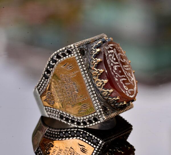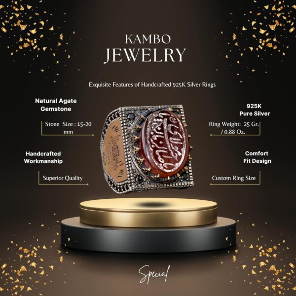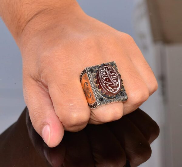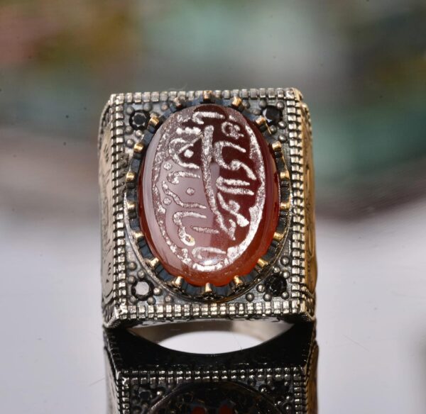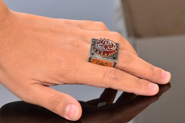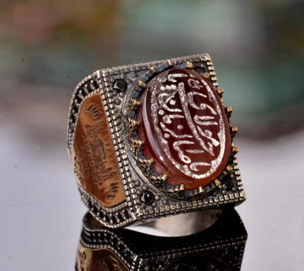- Doğal Akik Taşı: Yüzük, manevi ve iyileştirici özellikleri ile bilinen, detaylı Arap oymaları ile süslenmiş doğal Akik taşını sergilemektedir.