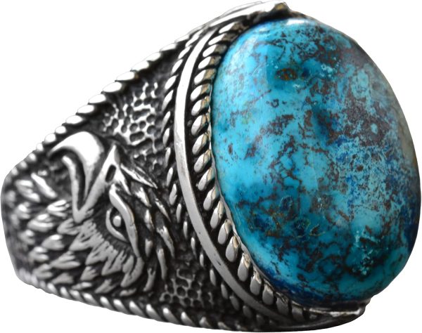 Gerçek bir Arizona turkuaz taşı içeren bu yüzük, her bir parçayı gerçekten eşsiz kılan canlı rengi ve benzersiz desenleri sergiler. Ayrıntılı kartal motifi, güç, cesaret ve özgürlüğü simgeleyen bir dokunuş ekler.