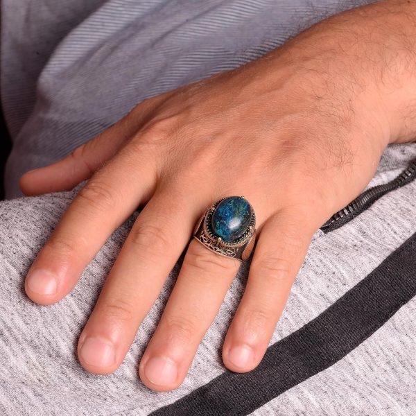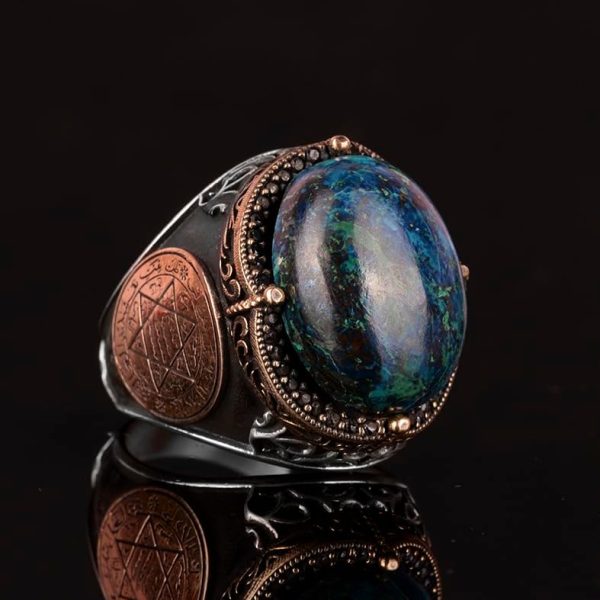Doğal Azurit Taşlı Yüzük, Davud Yıldızı Gümüş Yüzük – Gizemli 925 Ayar Sert Gümüş Erkek Yüzüğü