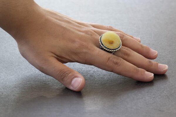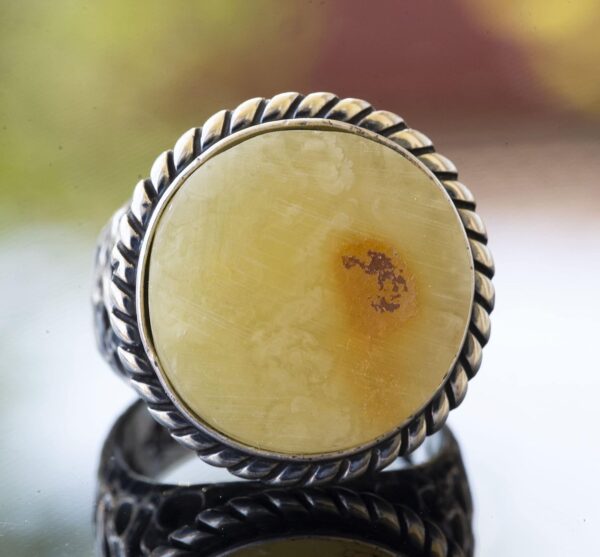 Doğal Baltık Kehribar Taşı Ham Taş 925 Ayar Gümüş Erkek Yüzüğünın doğal güzelliğini keşfedin. Bu olağanüstü parça, sıcak tonları ve organik damarlarıyla bilinen gerçek bir Baltık kehribar taşını içermektedir. Ham taş tasarımı rustik ve otantik bir dokunuş ekleyerek dikkat çekici bir aksesuar haline getiriyor.