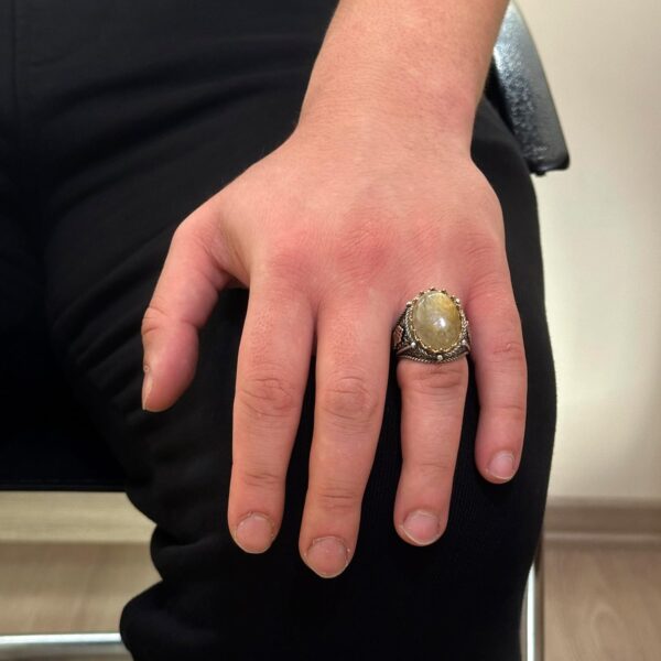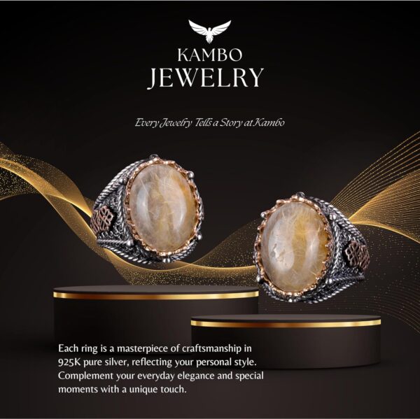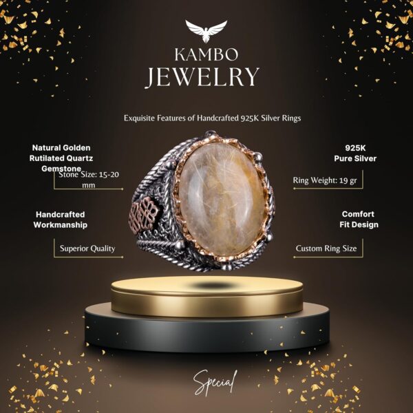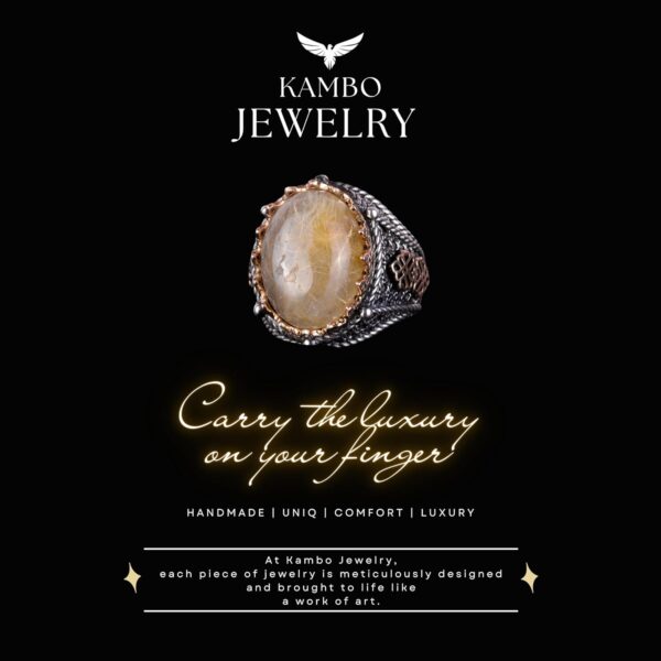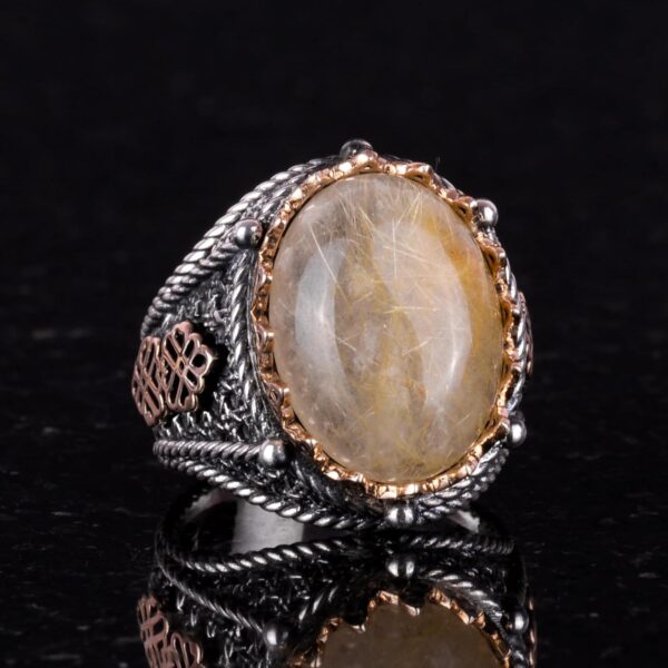 Doğal Cabochon Altın Rutilli Kuvars Taşı Yüzük, Mistisizm 925 Ayar Sert Gümüş Erkek Yüzüğü