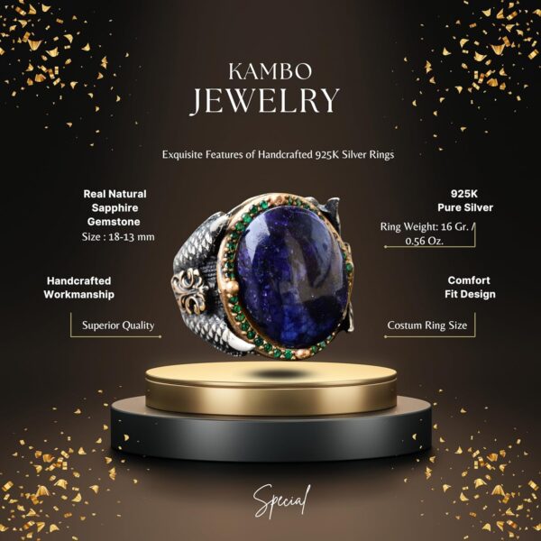 KAMBO Doğal Cabochon Safir Taşı Yüzük ile zarafeti ve şıklığı kucaklayın. Bu özenle tasarlanmış yüzük, bilgelik, doğruluk ve ruhsal aydınlanmayı simgeleyen çarpıcı bir doğal cabochon safir taşı içerir. Yüksek kaliteli 925 ayar gümüşten üretilen bu yüzük, hem dayanıklı hem de şık olup, günlük kullanım veya özel etkinlikler için mükemmeldir.