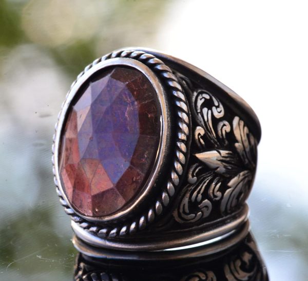 Doğal Granat Taşlı Yüzük – Lily Desenli Erkek Yüzüğü – 925 Ayar Sterlin Gümüş Tasarım