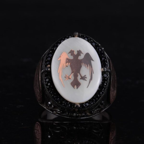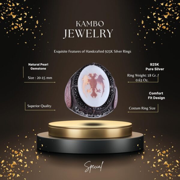 Doğal İnci Taşlı Yüzük – 925 Ayar Gümüş El Yapımı Erkek Yüzüğü – İki Başlı Kartal Tasarımı
