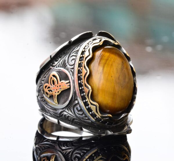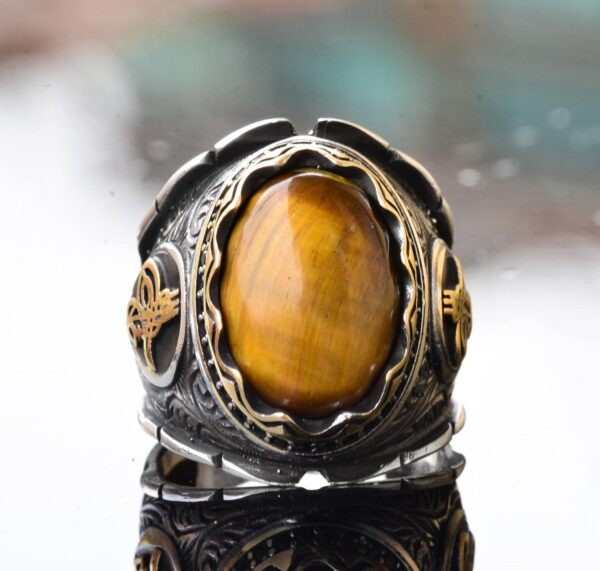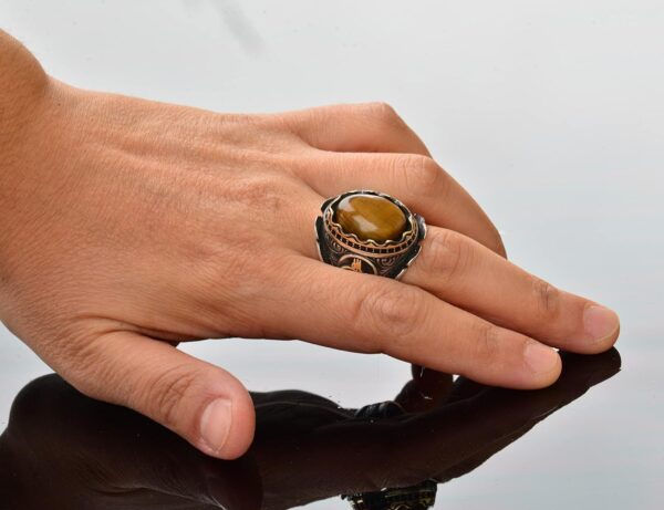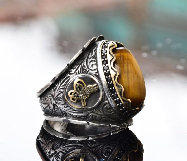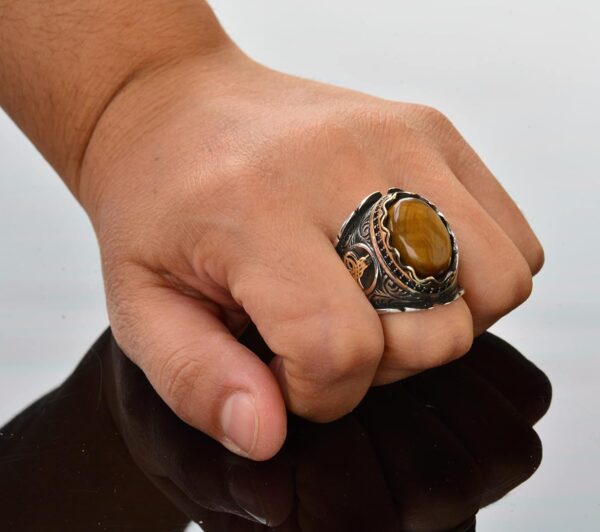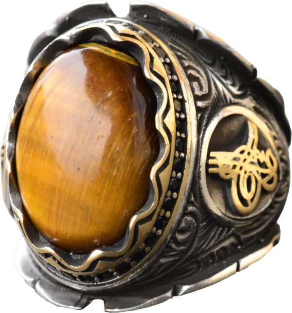 Doğal Kaplan Gözü Taşı ile El Yapımı 925 Ayar Gümüş Erkek Yüzük – Ayrıntılı Osmanlı Mühür Tasarımı – Taş Yüzük