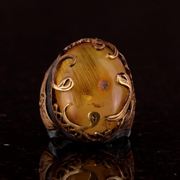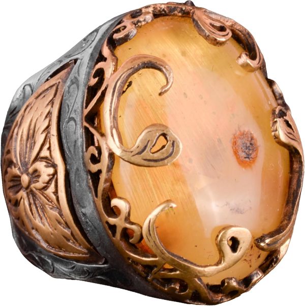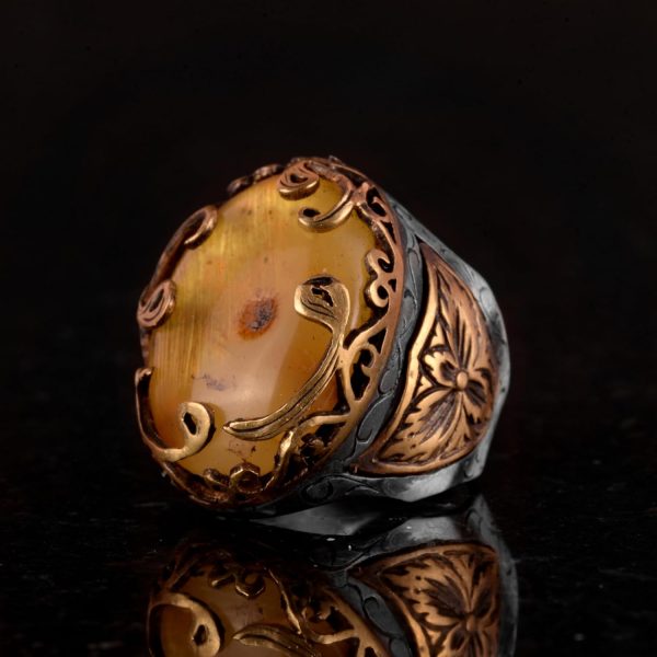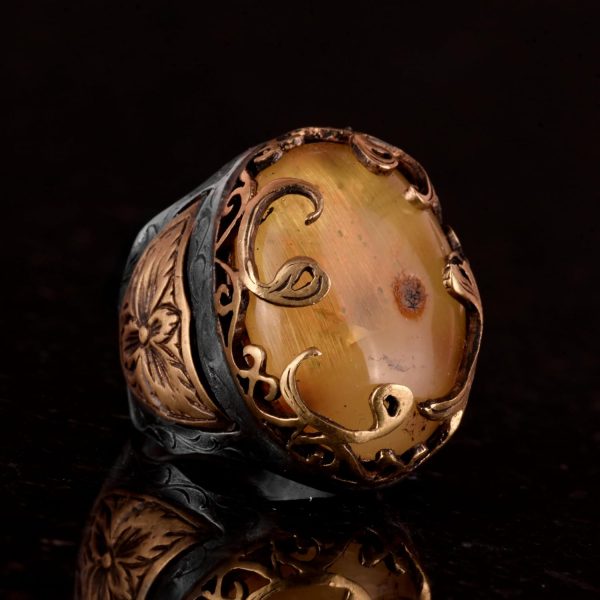 Doğal Kehribar Taşlı Gümüş Yüzük, 925 Ayar Katı Gümüş Erkek Yüzüğü, Etnik Tasarım Erkek Yüzüğü