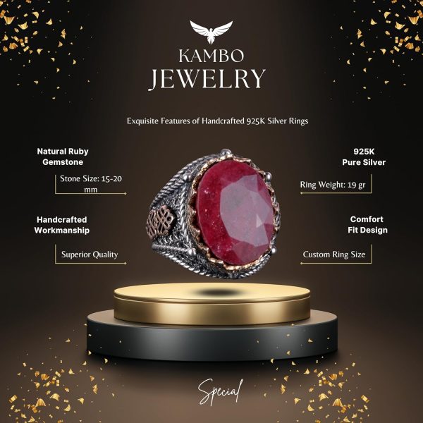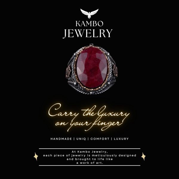 Yüzüğün tasarımı, doğanın sunduğu en güzel taşlardan biri olan kırmızı yakut ile harmanlanmıştır. Taşın boyutu 20-15 mm olup, 19 gram ağırlığındadır. Her bir yüzük, kullanıcısının kişisel tarzına ve ölçülerine göre özelleştirilebilir, bu da onu daha da özel kılar.