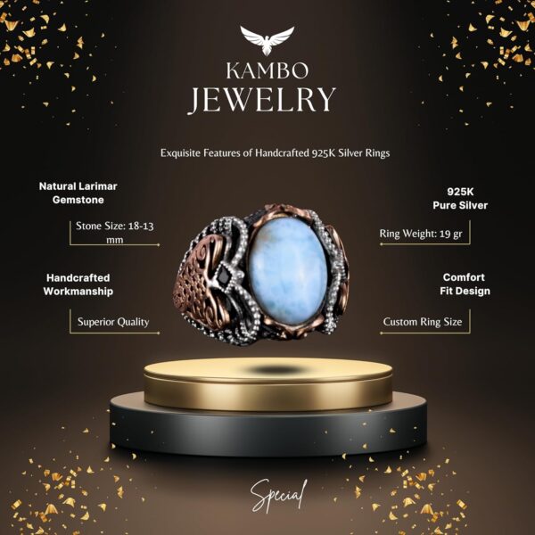 Doğal Larimar Taşlı Yüzük, 925K Saf Gümüş Erkek Yüzüğü, Okyanus Sakinliği Tasarımı