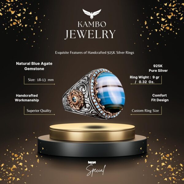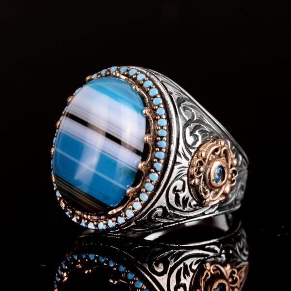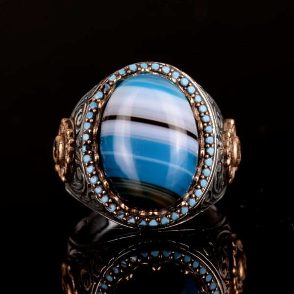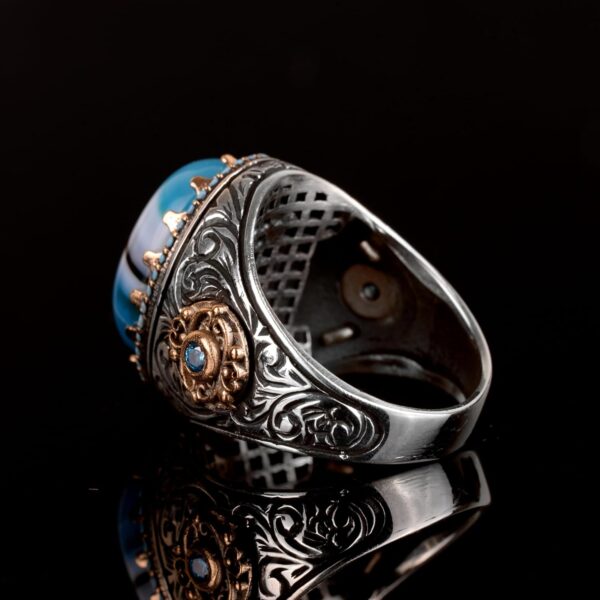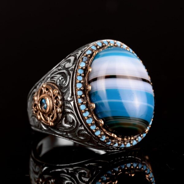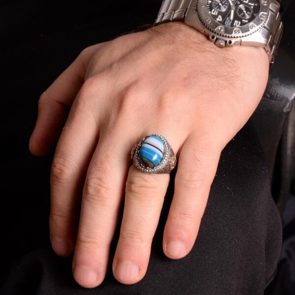 Doğal Mavi Akik Taşı Yüzük, 925 Ayar Gümüş Yüzük, Erkek Yüzüğü